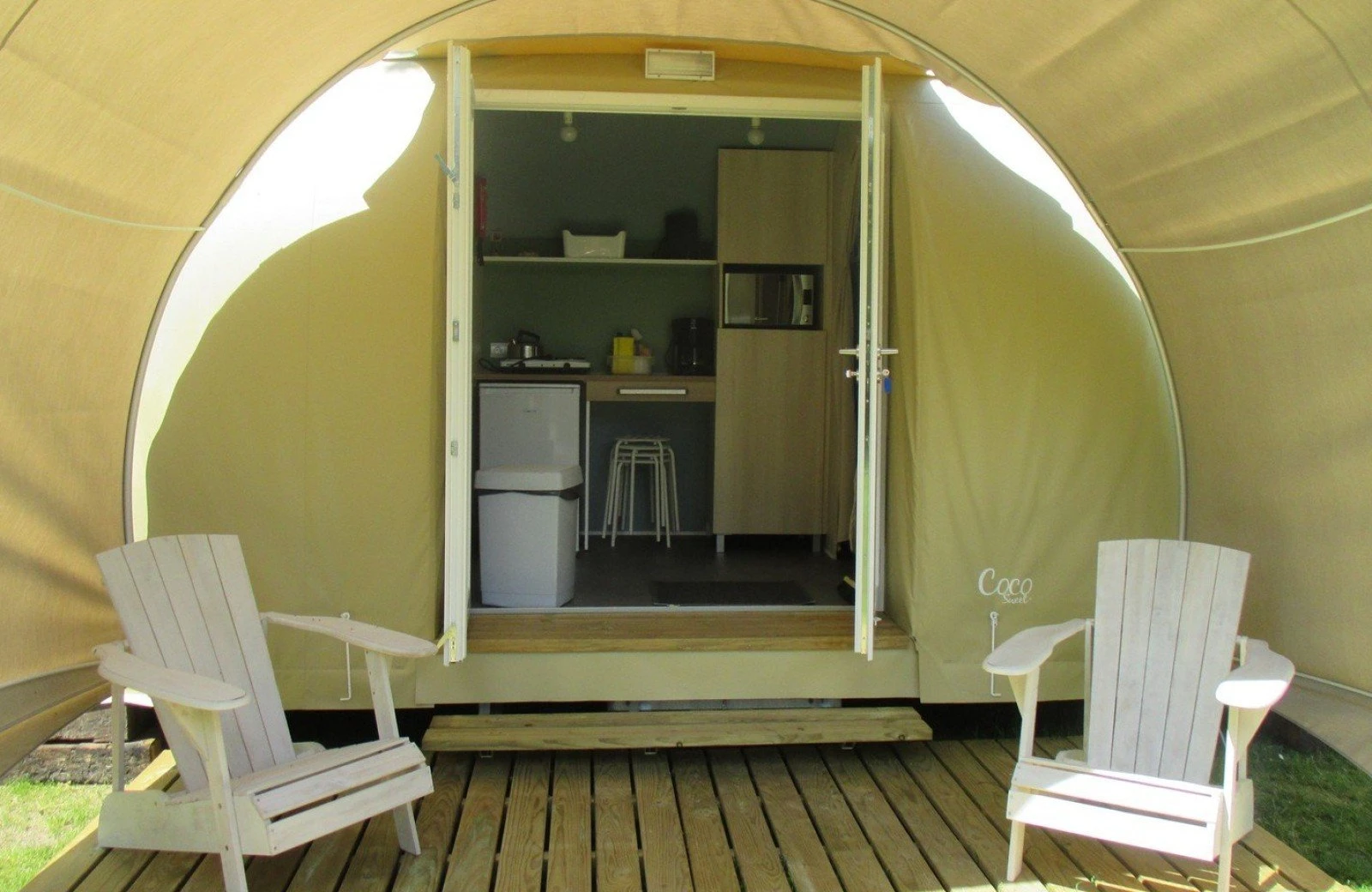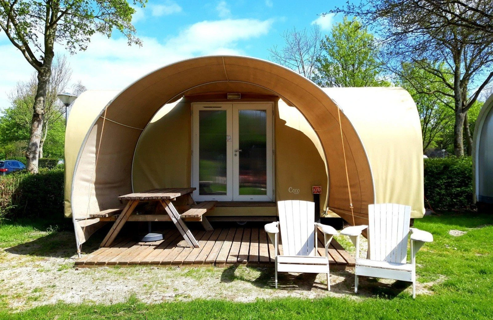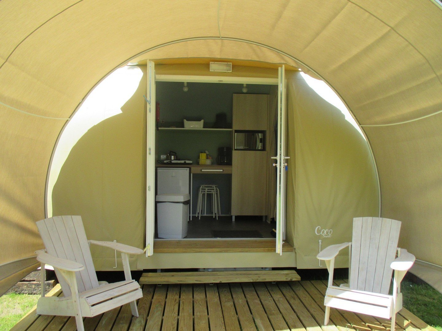 Pour les campeurs aventureux et sportifs qui ne souhaitent pas emporter leur propre tente : la Coco est entièrement prête à votre arrivée. Plus besoin de transporter des piquets ou des sardines — il suffit d’arriver, d’entrer et de profiter de vacances en camping clé en main.